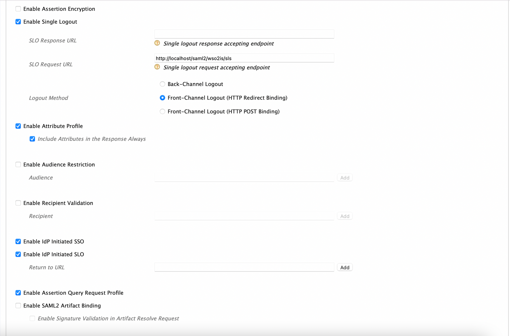 | Enable Attribute Profile | Selected | The identity server provides support for a basic attribute profile where the identity provider can include the user’s attributes in the SAML statements as part of the attribute declaration. |