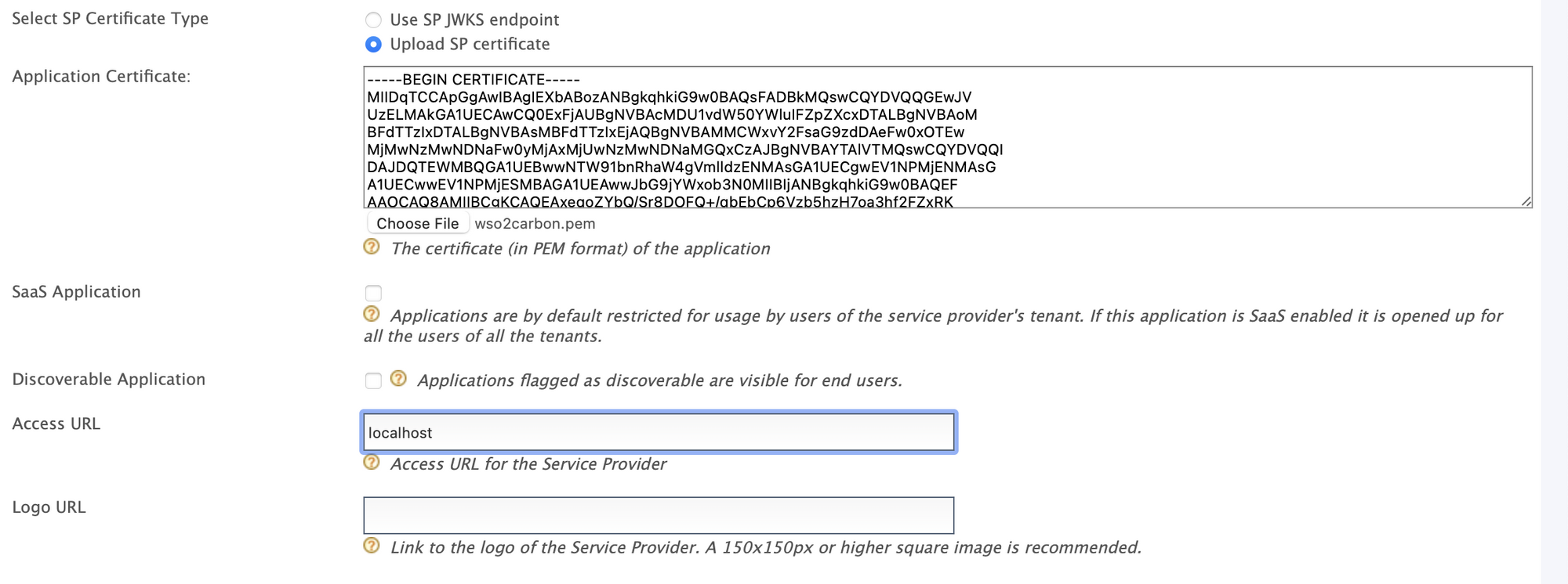 | Assertion Consumer URLs | http://localhost/saml2/wso2is/metadata http://localhost/saml2/wso2is/sls http://localhost/saml2/wso2is/acl | This is the URL to which the browser should be redirected after successful authentication. |