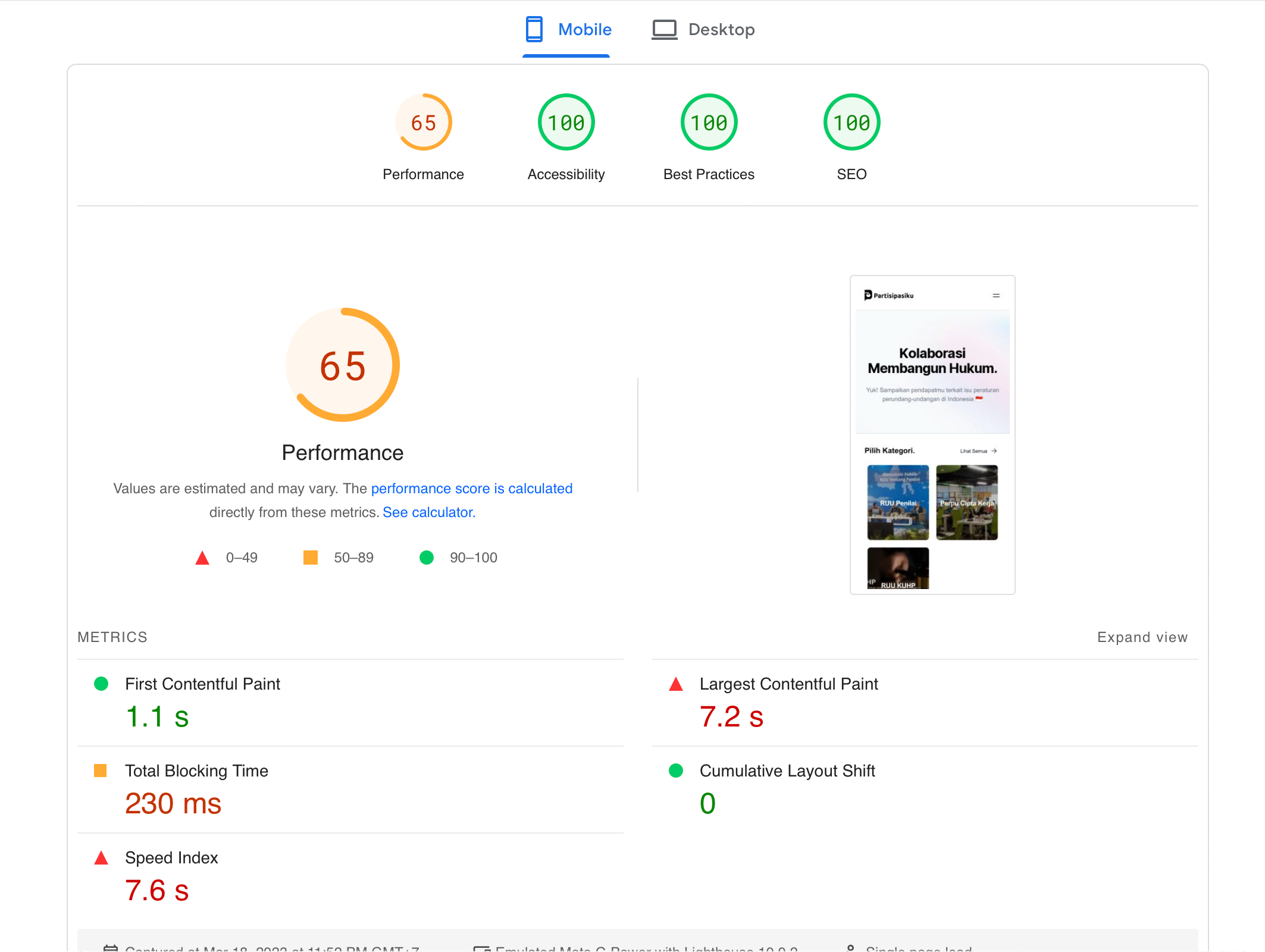 Saat ini hasilnya dapat dilihat di Partisipasiku!. Score Web Vitals Metrics meningkat jauh dibandingkan versi sebelumnya walaupun masih banyak ruang untuk improvement , salah satunya performa server. Saat ini partisipasiku di-hosting di data center Kementerian Hukum dan HAM RI namun performa nya fluktuatif. Berbeda jauh dengan score yang di dapat jika di host langsung di Vercel.