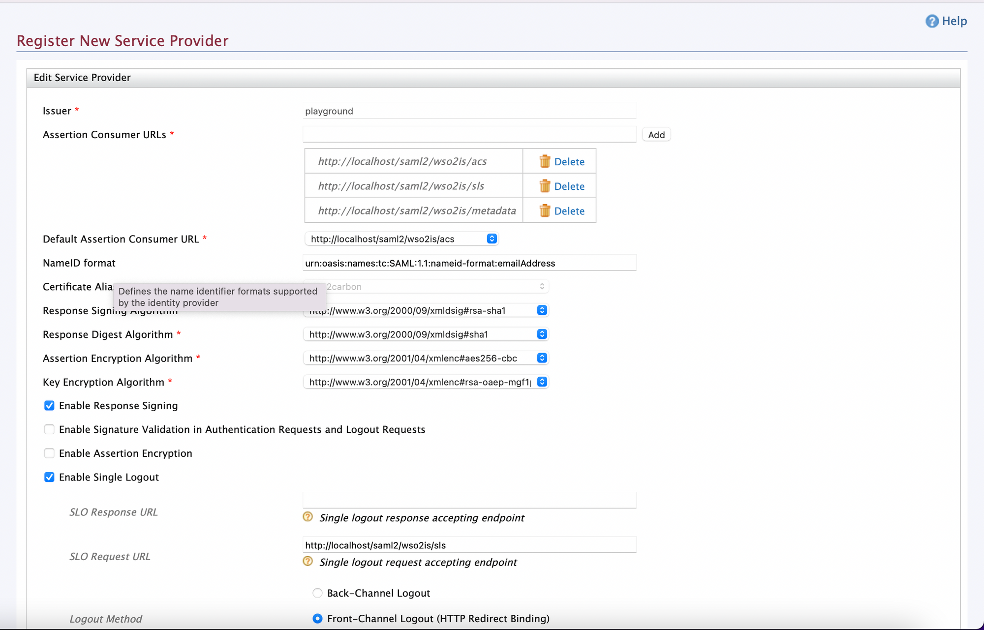| Assertion Consumer URLs | http://localhost/saml2/wso2is/metadata http://localhost/saml2/wso2is/sls http://localhost/saml2/wso2is/acl | This is the URL to which the browser should be redirected after successful authentication. |