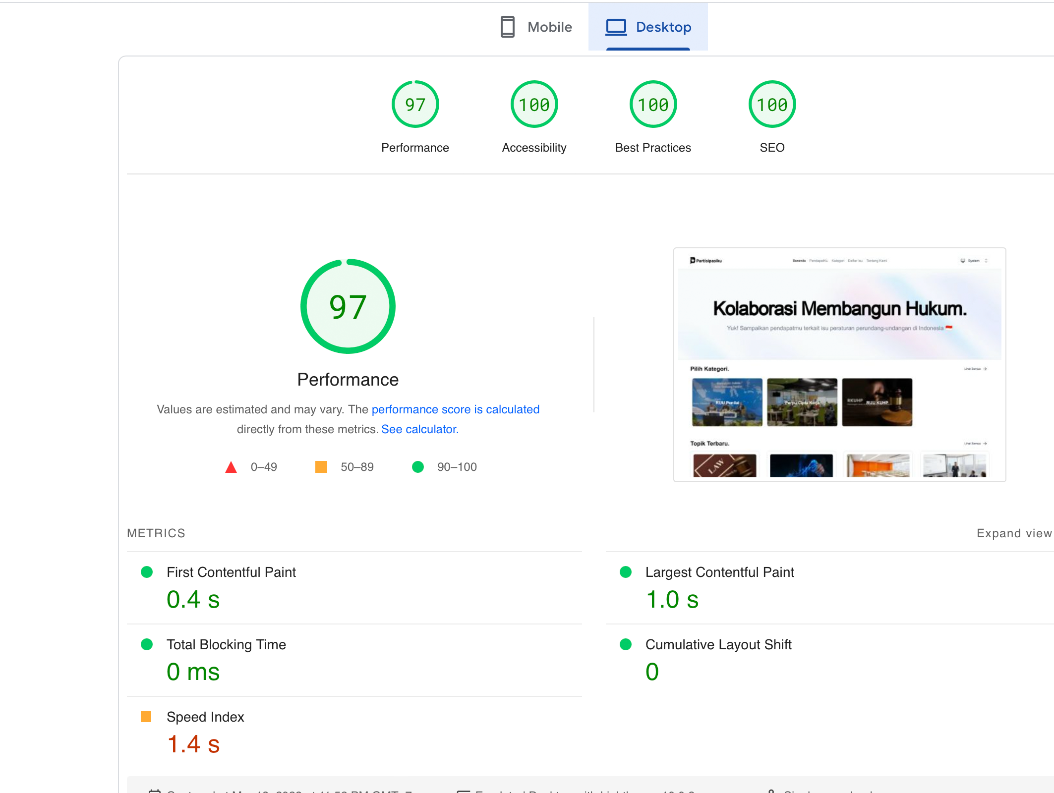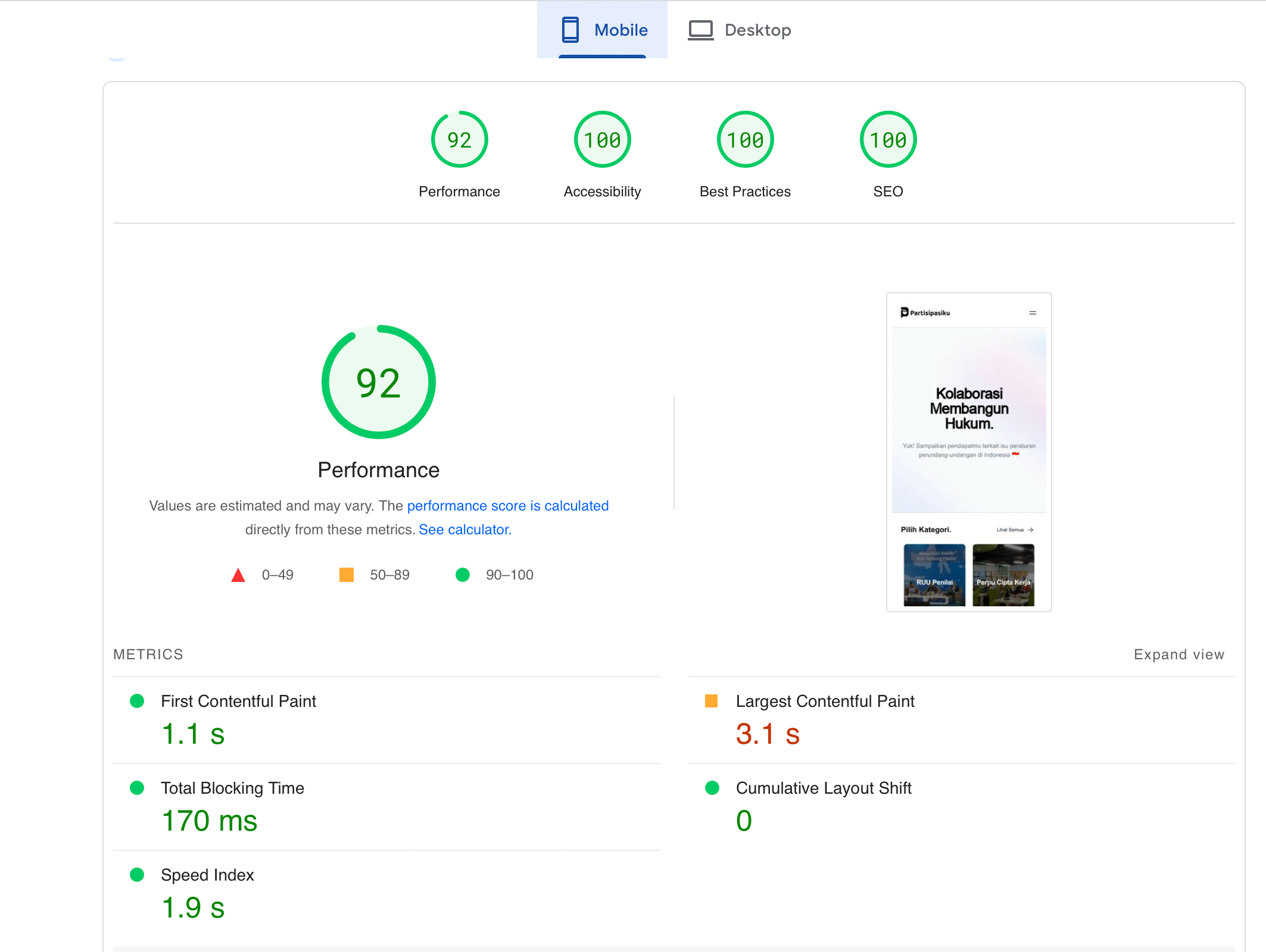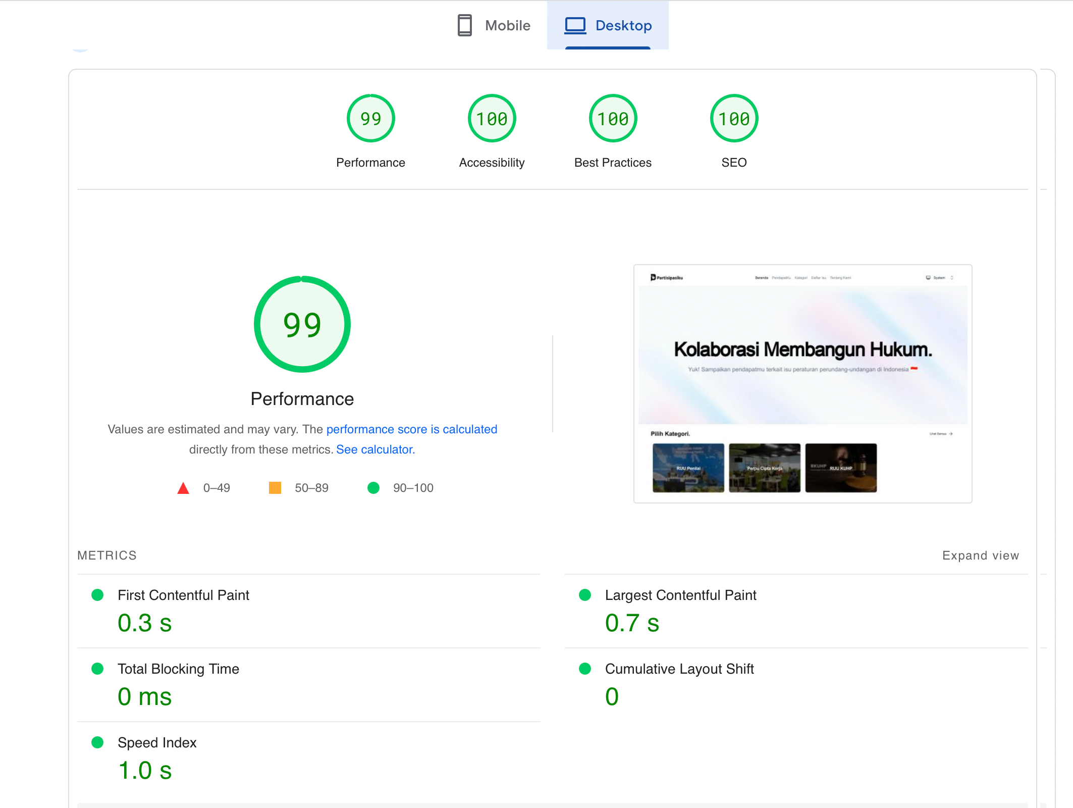 Saat ini hasilnya dapat dilihat di Partisipasiku!. Score Web Vitals Metrics meningkat jauh dibandingkan versi sebelumnya walaupun masih banyak ruang untuk improvement , salah satunya performa server. Saat ini partisipasiku di-hosting di data center Kementerian Hukum dan HAM RI namun performa nya fluktuatif. Berbeda jauh dengan score yang di dapat jika di host langsung di Vercel.